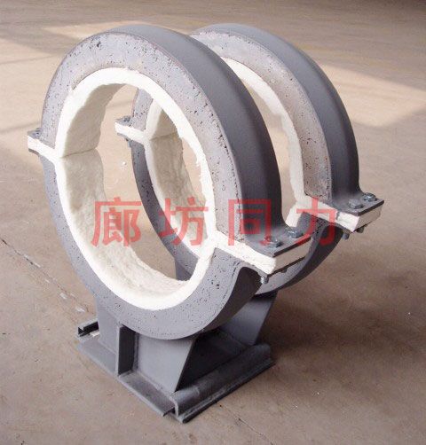 隔熱管托適用于高溫蒸汽管道的支撐部位,配件包括底座、管夾、隔熱層。隔熱材料一般選用蛭石、硅酸鈣、澆筑復(fù)合材料等。澆筑復(fù)合材料是一種硬質(zhì)隔熱保溫材料,主要由陶粒、珍珠巖、鐵黑粉、氧化鎂通過(guò)粘結(jié)劑混合后固化而成。陶粒和珍珠巖能起到較好的隔熱保溫作用;鐵黑粉與陶粒珍珠巖氧化鎂混合后凝結(jié)在一起,能提高抗壓強(qiáng)度及硬度;加入硅酸鋁后能提高粘結(jié)牢度,進(jìn)一步提高強(qiáng)度和硬度,降低導(dǎo)熱系數(shù)。產(chǎn)品具有抗壓強(qiáng)度高、熱傳導(dǎo)率低、吸水率低的特點(diǎn),適應(yīng)既要低導(dǎo)熱系數(shù),又要高抗壓系數(shù)的場(chǎng)合。
