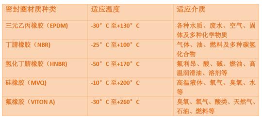 橡膠材質:三元乙丙橡膠、硅膠、氟膠、丁腈橡膠等。